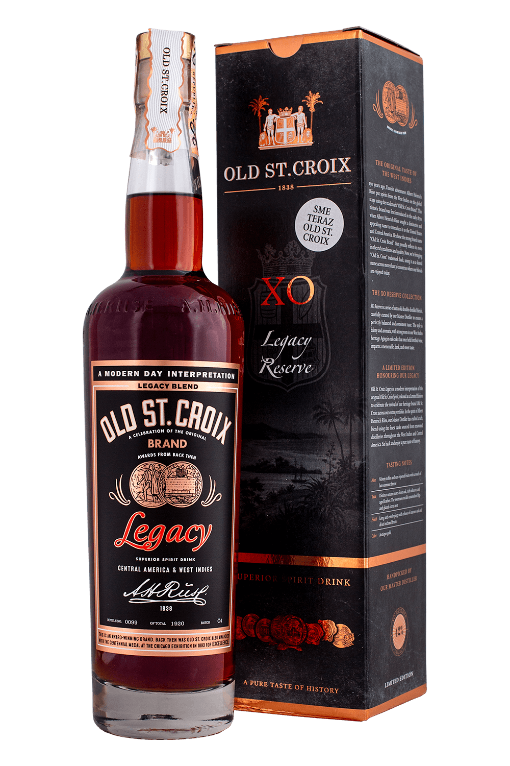 Old St. Croix XO Legacy Reserve je prémiový rum inšpirovaný odkazom dánskeho farmaceuta a dobrodruha Alberta Heinricha Riiseho, ktorý už pred viac než 150 rokmi preslávil destiláty zo Západnej Indie. Táto limitovaná edícia nadväzuje na historickú značku Old St. Croix a prináša moderné spracovanie tradičnej zmesi. Vôňa ponúka zamatový karamel a zrelé ovocie, chuť je bohatá s tónmi dubu, tabaku, kože a karamelizovaných fíg, doplnená jemným citrusovým nádychom. Dlhý, hrejivý záver a starozlatá farba robia z tohto rumu ideálnu voľbu na pomalé vychutnávanie aj ako reprezentatívny darček.