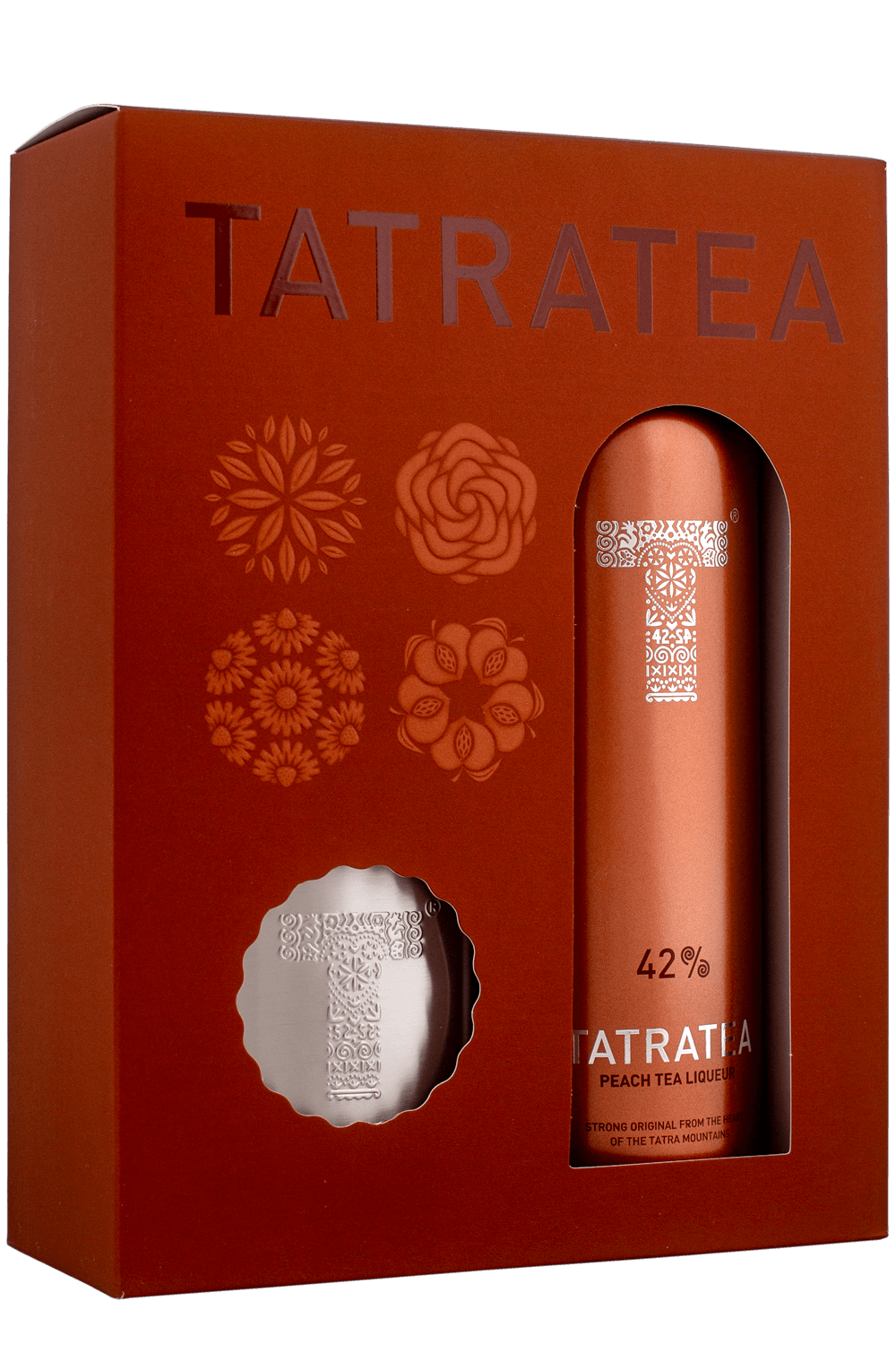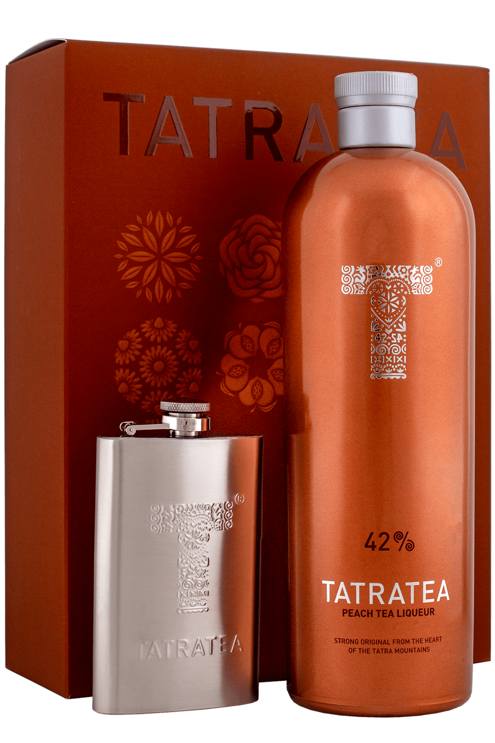 Tatratea Peach v darčekovom balení s nerezovou ploskačkou s objemom 140 ml.
