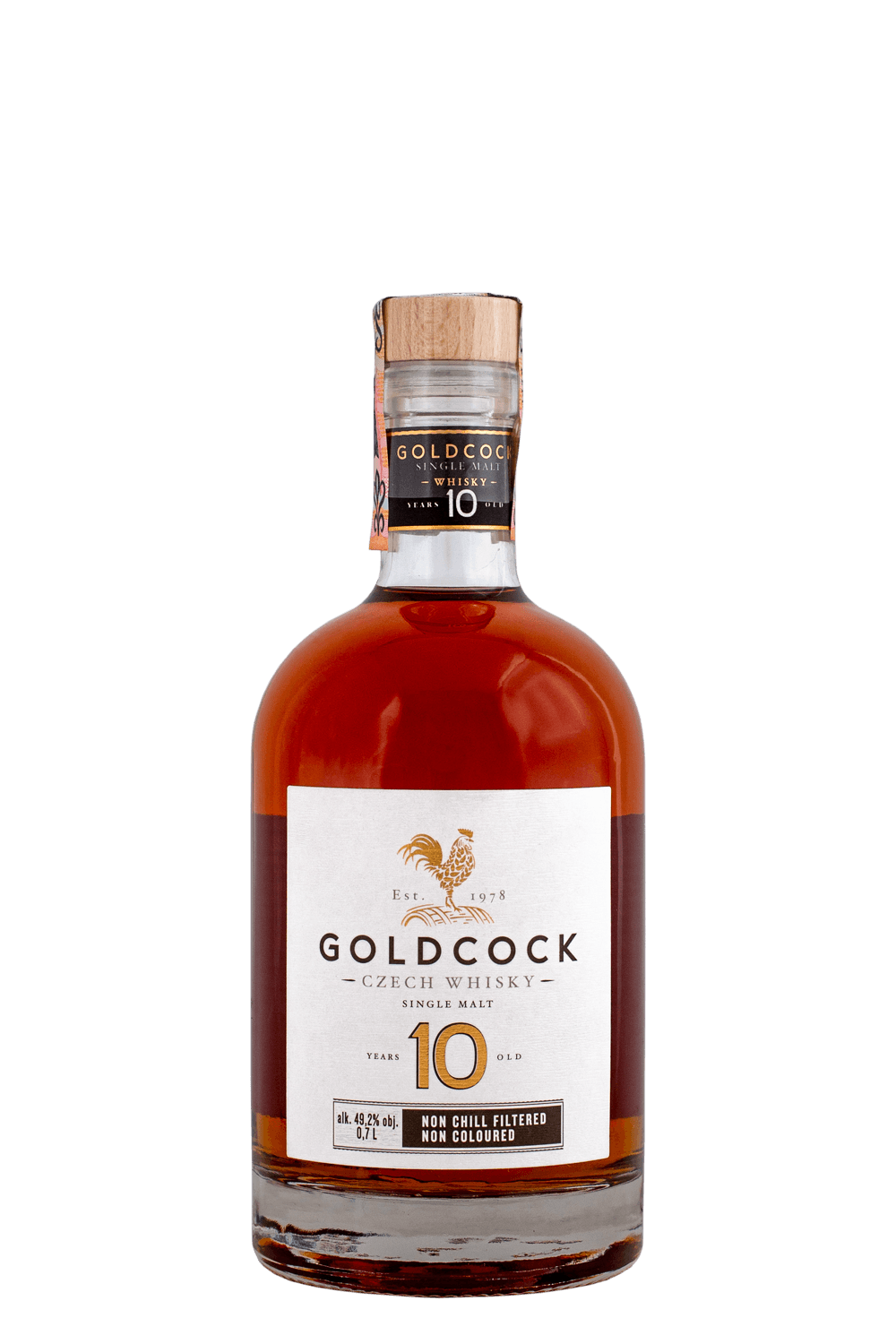 Whisky Goldcock 10-ročná bola stočená s obsahom alkoholu 49,2%, pričom percento alkoholu vo whisky zodpovedá rovnobežke, ktorá pretína sídlo spoločnosti Rudolf Jelínek. Whisky Goldcock 10-ročná je prvý Goldcock destilovaný na moderných kotloch Arnold Holstein, pričom všetky ostatné časti výroby zostali pôvodné a v mnohých ohľadoch historické.